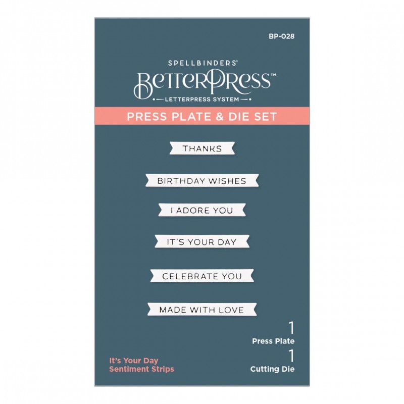 It’s Your Day Sentiment Strips Press Plate & Die Set is part of the BetterPress Collection by Spellbinders. This press plate has a list of six short and sweet sentiments for all occasions with a matching thin metal cutting die to cut all of them at the same time! Make them ahead of time and have them ready to go when you are. Perfect for cardmakers! Ink the plate with the BetterPress Ink to be pressed against the BetterPress Cotton Card Panel and Sheets to create a crisp letterpress design.