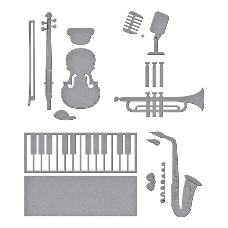 Mini Musical Instruments Etched Dies are part of the Bibi's Musical Notes Collection by Bibi Cameron. Create a musical ensemble with this set of 13 thin metal cutting dies! Includes everything from horns, strings, keyboard and even a microphone. You can hear the music already!