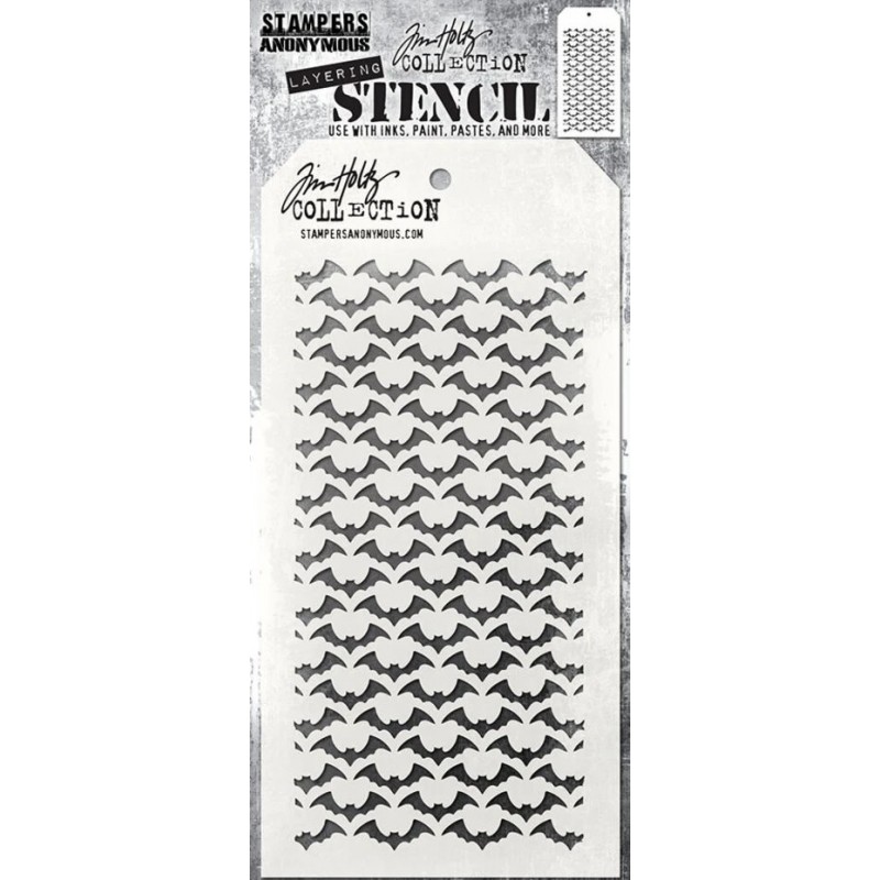 Tim Holtz Layering Stencils, BATGROUND There is no doubt the versatility of stencils make them the latest must have tools. Tim Holtz has designed these stencils so that they are a little more imperfect as a way to add texture and imagery. Use these stencils to layer inks, paints, stains - so many creative ways to use them to enhance your projects. Tag-shaped autumn themed stencil measures 4 1/8" x 8 1/2", with a convenient hole in top to attach with a Cable Binder Ring (sold separately).