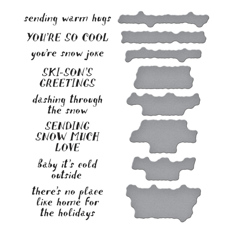 Ski-son's Greetings Sentiments BetterPress Plate & Die Set presses eight sentiments at once with one press plate, then die-cuts them all with the coordinating thin metal cutting die. A time saving set to get you started with eight sentiments. Use them individually or group them for a longer phrase. Works perfectly with the rest of this collection! Ink the plates with the BetterPress Ink to be pressed against the BetterPress Cotton Card Panel and Sheets for a crisp letterpress design.