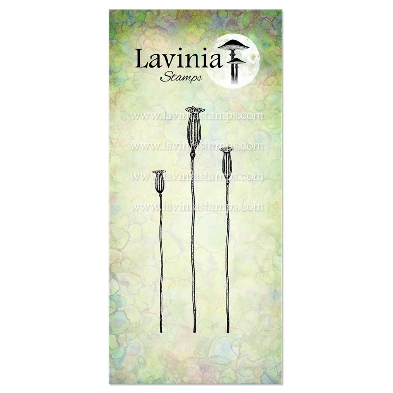 Un ensemble de trois tampons représentant des capsules de graines fermées et élancées, montées sur de longues tiges, chacune présentant des proportions et des caractéristiques légèrement différentes pour une variation naturelle.