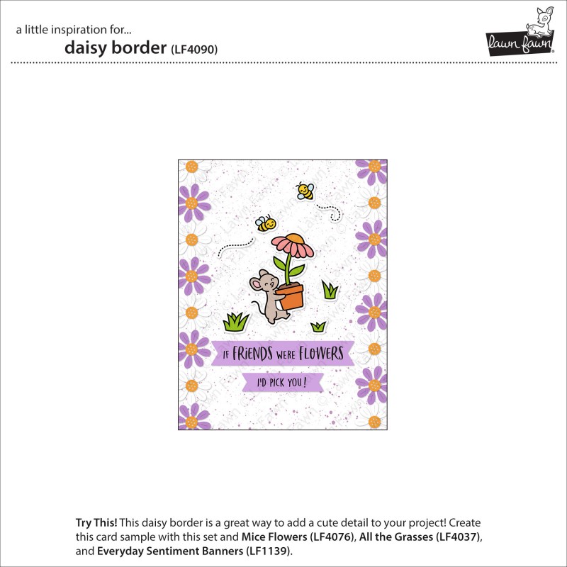The border is perfect for landscape or portrait cards! Use the included single daisy layers to add lots of color to your border; adhere them flat or pop them up with foam tape or squares for a fun dimensional look. Use your favorite cardstock (shiny is super fun) or patterned paper for a unique look each time!