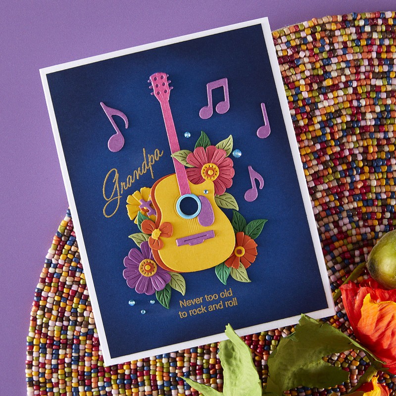 Mini Guitar Etched Dies are part of the Bibi's Musical Notes Collection by Bibi Cameron. When assembled, this set of 11 thin metal cutting dies makes an amazing guitar, along with floral accents to make it even lovelier!