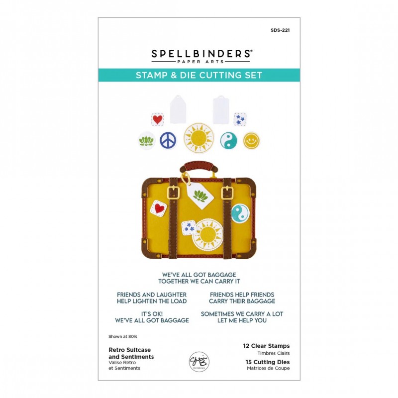 SPELLBINDERSRETRO SUITCASE AND SENTIMENTS CLEAR STAMP and Die SET by SHERI BALLANTYNE