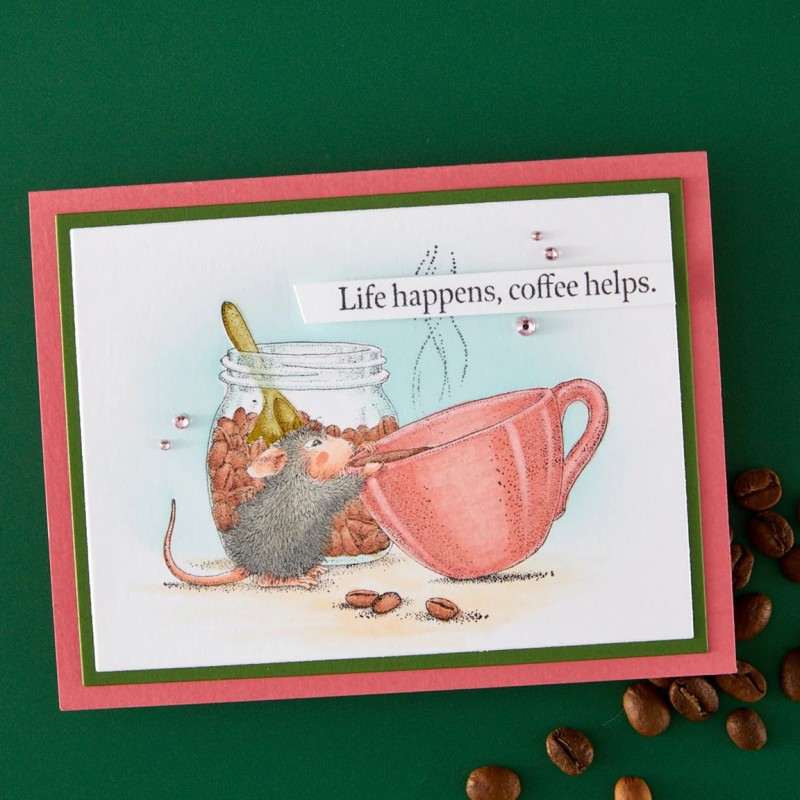 Brew-tiful Day Cling Rubber Stamp Set is part of the House-Mouse Heart and Soul Collection. Amanda is taking a big sip of freshly brewed coffee to start her day! In addition to the focal point image, the set of four stamps includes three sentiments: Have a brew-tiful day!, Thanks a latte for being you!, and Life happens coffee helps. Designed to be used with a stamp acrylic block.